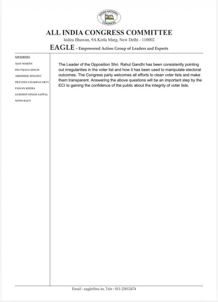 EAGLE समिति, जिसमें अजय माकन, दिग्विजय सिंह, अभिषेक मनु सिंघवी, प्रवीण चक्रवर्ती, पवन खेड़ा, गुरदीप सिंह सप्पल और नितिन राऊत जैसे वरिष्ठ नेता शामिल हैं, ने अपनी विस्तृत रिपोर्ट में कहा कि बिहार की वोटर लिस्ट में मौजूद गड़बड़ियों के पीछे या तो “गंभीर लापरवाही” है या “जानबूझकर की गई राजनीतिक हेराफेरी।”