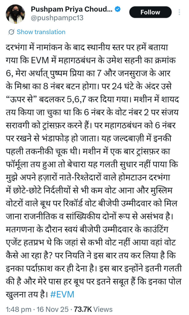 बिहार की राजनीति में एक बार फिर भूचाल लाने वाला बयान आया है—और इस बार यह आरोप किसी साधारण कार्यकर्ता का नहीं, बल्कि सोशल मीडिया पर अपनी स्पष्टवादिता के लिए जानी जाने वाली नेता पुष्पम प्रिया चौधरी का है। उन्होंने X (पूर्व में ट्विटर) पर एक विस्तृत पोस्ट में दावा किया है कि दरभंगा में उनके नामांकन के तुरंत बाद EVM की बटन पोज़ीशन को “ऊपर से” बदल दिया गया, जिससे संदेह का एक नया सिलसिला शुरू हो गया है। उनके अनुसार, स्थानीय स्तर पर पहले बताया गया था कि चुनावी मशीन में क्रम 6 पर महागठबंधन के उमेश सहनी, 7 पर वह खुद—पुष्पम प्रिया—और 8 पर जनसुराज के आर.के. मिश्रा होंगे। लेकिन, सिर्फ 24 घंटे के भीतर आदेश बदल दिया गया और क्रम 5, 6, 7 कर दिया गया। वह दावा करती हैं कि यह बदलाव एक ऐसे ‘ट्रांसफ़र फॉर्मूले’ को बचाने के लिए किया गया, जिसके मुताबिक़ 6 नंबर का वोट सीधे बीजेपी उम्मीदवार संजय सरावगी के लिए ट्रांसफ़र होना था। उनकी दलील में यह भी शामिल है कि यदि महागठबंधन 6वें नंबर पर रहता, तो “सेटिंग” पकड़ी जा सकती थी—इसलिए बटन ऊपर-नीचे कर दिए गए।