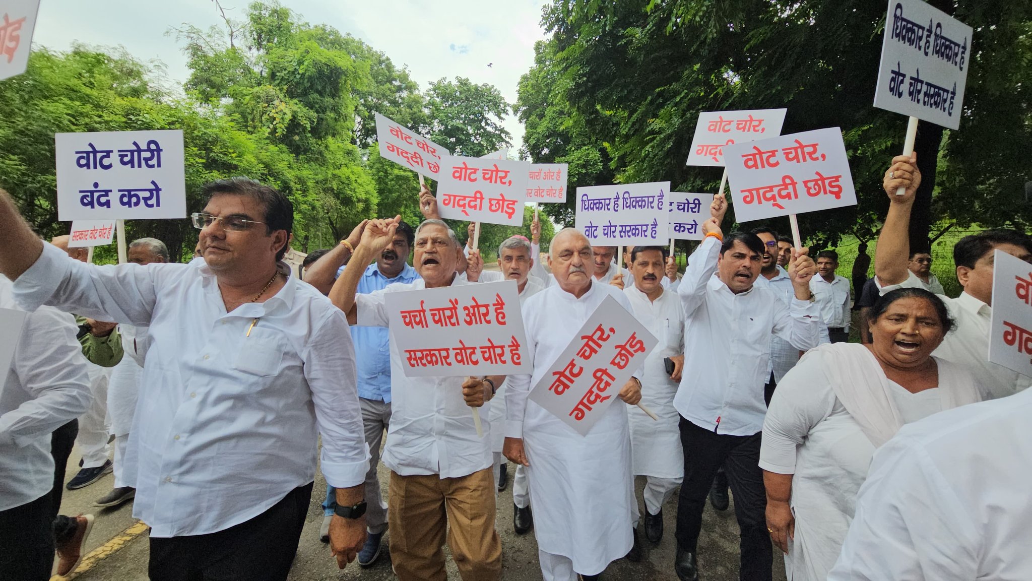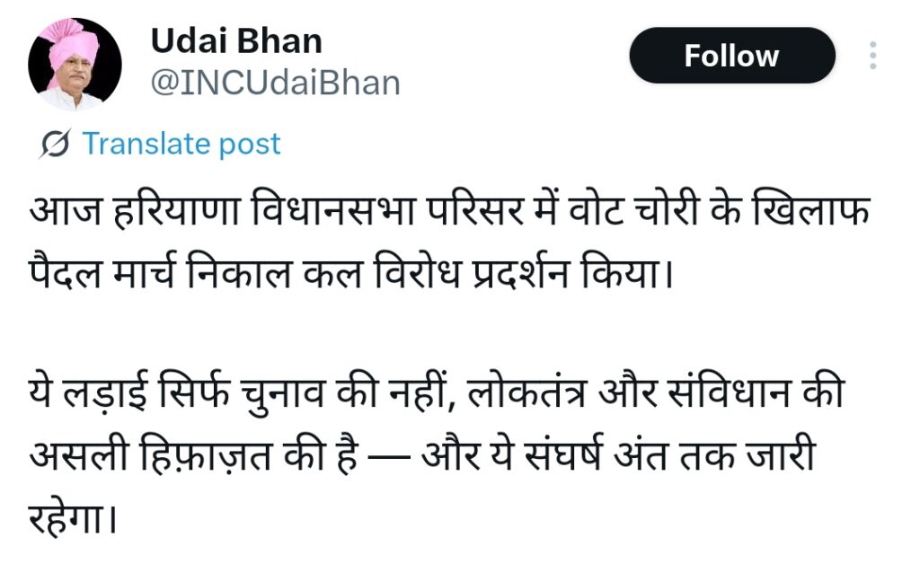 कांग्रेस नेताओं के इस मार्च और विरोध प्रदर्शन में हरियाणा कांग्रेस अध्यक्ष चौ. उदय भान भी पूरे तेवर में दिखे। उन्होंने भी X पर लिखा – “यह लड़ाई चुनाव भर की नहीं है। यह असली जंग है संविधान और लोकतंत्र की हिफ़ाज़त की। वोट की चोरी सिर्फ एक सीट या एक पार्टी से धोखा नहीं है, बल्कि हर हरियाणवी नागरिक की आवाज़ को कुचलने की कोशिश है।” उदय भान ने साफ कहा कि यह संघर्ष अंत तक चलेगा और जनता को धोखा देकर बनाई गई सरकार ज्यादा दिन नहीं टिक पाएगी।