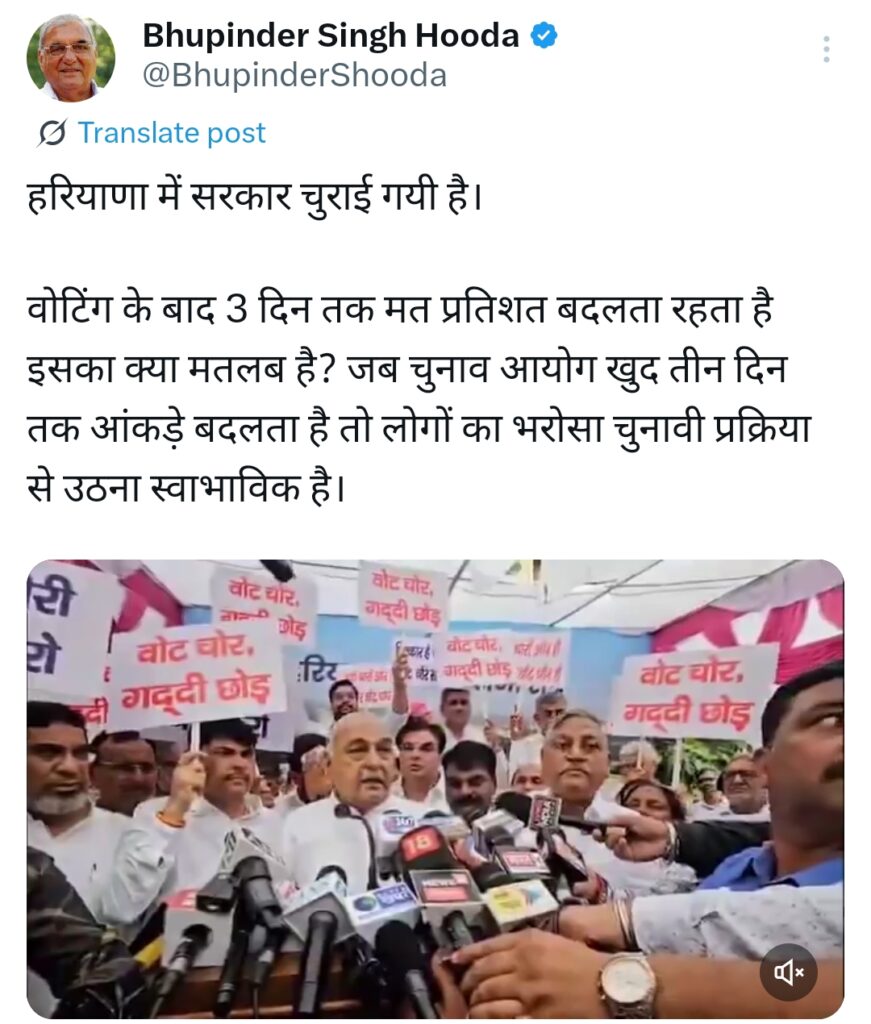हुड्डा ने X (पूर्व ट्विटर) पर लिखा – “हरियाणा में सरकार चुराई गई है। जब चुनाव आयोग तीन दिन तक आंकड़े बदलता रहता है, तो जनता का भरोसा टूटना स्वाभाविक है। यह जनता की अदालत और जनता का फैसला है जिसे सत्ता के दबाव में पलटा जा रहा है।” उन्होंने साफ चेतावनी दी कि लोकतंत्र और संविधान की रक्षा के लिए कांग्रेस की लड़ाई सिर्फ आज की नहीं, बल्कि अंतिम निर्णायक संघर्ष तक जारी रहेगी।