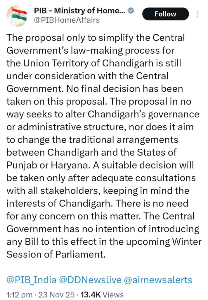 चंडीगढ़ को लेकर पिछले कुछ दिनों से राजनीतिक गलियारों में चल रही हलचल और चर्चाओं के बीच मोदी सरकार ने आधिकारिक रूप से स्पष्ट किया है कि चंडीगढ़ से जुड़े किसी भी बड़े बदलाव पर अभी कोई अंतिम निर्णय नहीं लिया गया है। सरकार का कहना है कि जो प्रस्ताव चर्चा में है, वह केवल केंद्र सरकार के कानून बनाने की प्रक्रिया को सरल करने से जुड़ा है, न कि चंडीगढ़ के प्रशासनिक ढांचे या शासन प्रणाली में बदलाव से। केंद्र ने साफ कहा है कि यह प्रस्ताव किसी भी तरह पंजाब या हरियाणा के पारंपरिक अधिकारों या व्यवस्थाओं को प्रभावित नहीं करता और इसका उद्देश्य मौजूदा संतुलन को बदलना नहीं है। सरकार ने जोर देकर कहा कि इस मुद्दे पर अनावश्यक चिंता या भ्रम फैलाने की जरूरत नहीं है।