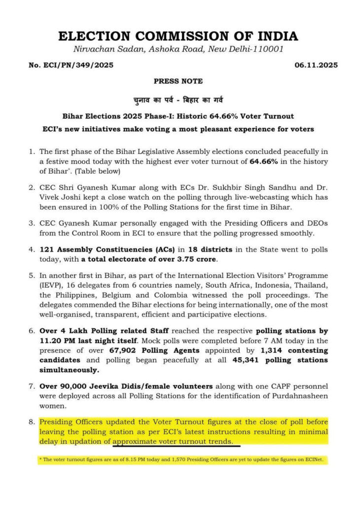 बिहार विधानसभा चुनाव 2025 का पहला चरण ऐतिहासिक बताया गया। चुनाव आयोग (ECI) ने बड़े गर्व से कहा कि इस बार 64.66% का रिकॉर्ड मतदान हुआ है — बिहार के चुनावी इतिहास का सबसे ऊँचा प्रतिशत। आयोग ने इसे “चुनाव का पर्व” और “बिहार का गर्व” कहा। पर सवाल यह है कि जब तकनीकी दृष्टि से हर मतदान केंद्र पर नियुक्त Presiding Officer (PRO) ने स्वयं मतदान समाप्त होने के तुरंत बाद ECINet सिस्टम पर वोटर टर्नआउट यानी मतदान प्रतिशत सीधे दर्ज किया, तो फिर चुनाव आयोग उन आंकड़ों को “approximate voter turnout trends” यानी “अनुमानित मतदान रुझान” क्यों कह रहा है? क्या यह शब्द मात्र एक तकनीकी औपचारिकता है या फिर इसके पीछे कोई गहरी साजिश छिपी हुई है? जबकि वास्तविकता यह है कि जब मतदान शुरू होता है, तो चुनाव आयोग (ECI) हर दो घंटे में आंकड़े जारी करता है, जिसमें बताया जाता है कि उस समय तक कितने प्रतिशत मतदान हुआ है। शाम को जब मतदान समाप्त हो जाता है, तो कुछ घंटों बाद आयोग एक अंतिम आंकड़ा जारी करता है — जो आमतौर पर पहले से 1 या 2 प्रतिशत ज्यादा होता है। तो फिर सवाल यह है — जब सब कुछ उसी दिन पूरा हो जाता है, तो अंतिम आंकड़े जारी करने में 2 से 3 दिन क्यों लगते हैं?