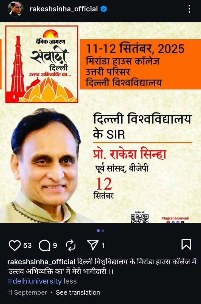 दिल्ली यूनिवर्सिटी के प्रोफेसर और बीजेपी के पूर्व सांसद राकेश सिन्हा पर अब गंभीर आरोप लग चुके हैं। यह मामला कोई मामूली चूक नहीं बल्कि लोकतंत्र और संविधान दोनों के साथ सीधा खिलवाड़ है। फरवरी 2025 में राकेश सिन्हा और उनकी पत्नी ने दिल्ली में वोट डाला था — सबूत मौजूद हैं। उनकी पत्नी अब भी दिल्ली की मतदाता सूची में दर्ज हैं। फिर अप्रैल 2025 में राकेश सिन्हा ने अचानक दिल्ली का वोटर आईडी कैंसिल करवाया और बिहार में नया बनवा लिया, यह कहकर कि उन्होंने अब स्थायी रूप से बिहार में निवास शुरू कर दिया है। लेकिन हकीकत इसके ठीक उलट है — सितंबर 2025 तक वे दिल्ली यूनिवर्सिटी के टीचर्स यूनियन (DUTU) चुनाव में मतदाता बने रहे, वहीं से सैलरी ले रहे थे और विभिन्न ‘संघी’ कॉन्क्लेव्स में बतौर “दिल्ली विश्वविद्यालय के प्रोफेसर” मंच साझा कर रहे थे।