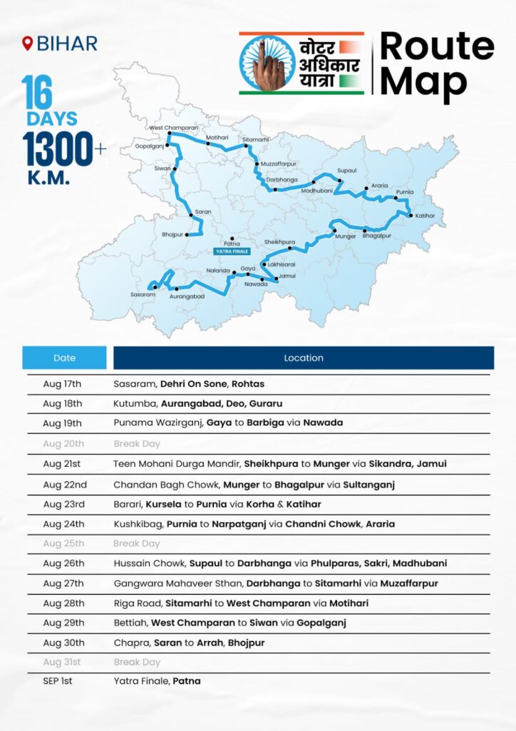कांग्रेस पार्टी ने बिहार से एक बड़ी राजनीतिक पहल की है। रविवार 17 अगस्त से राज्य में ‘वोटर अधिकार यात्रा’ की शुरुआत की गई है, जिसका नेतृत्व पार्टी के पूर्व अध्यक्ष और सांसद राहुल गांधी कर रहे हैं। यह यात्रा 16 दिनों तक चलेगी और 20 से अधिक जिलों को कवर करते हुए लगभग 1,300 किलोमीटर की दूरी तय करेगी। कांग्रेस ने इसे केवल एक चुनावी कार्यक्रम नहीं, बल्कि लोकतंत्र और संविधान को बचाने का आंदोलन बताया है। इससे पहले कांग्रेस और राहुल गांधी ने सोशल मीडिया पर लिखा था कि—“16 दिन, 20+ ज़िले, 1,300+ किमी। हम वोटर अधिकार यात्रा लेकर जनता के बीच आ रहे हैं। यह सबसे बुनियादी लोकतांत्रिक अधिकार—‘एक व्यक्ति, एक वोट’ की रक्षा की लड़ाई है। संविधान को बचाने के लिए बिहार में हमारे साथ जुड़िए।”