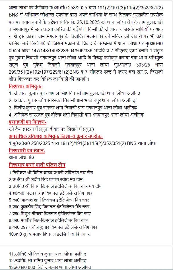 थाना लोधा में दर्ज एफआईआर संख्या 258/2025 में आरोपियों पर धारा 191(2)/191(3)/115(2)/352/351(2) BNS सहित कई धाराओं में केस दर्ज हुआ है। अलीगढ़ पुलिस ने प्रेस कॉन्फ्रेंस में खुलासा किया कि 25 अक्टूबर को बुलकाकड़ी और भगवानपुर क्षेत्र में यह घटना जानबूझकर की गई थी ताकि माहौल बिगाड़ा जा सके। आरोपी ज़ीशान कुमार उपरोक्त ने अपने साथियों के साथ मिलकर मंदिर की दीवार पर धार्मिक नारे लिखे, और फिर सोशल मीडिया पर इसे फैलाने की योजना बनाई।