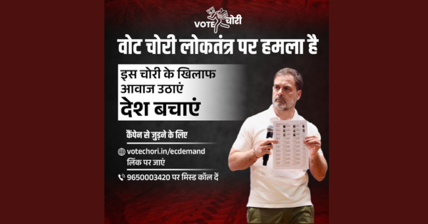 उठो, जागो और लड़ो… अपने वोट की रक्षा करो! @RahulGandhi के साथ #VoteChori के खिलाफ इस जनांदोलन में शामिल हों, votechori.in पर लॉगिन करें.. या 9650003420 पर मिस्ड कॉल दें। लोकतंत्र बचाने की इस लड़ाई में आपकी आवाज़ ही हमारी ताक़त है!