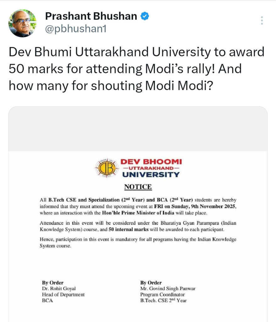 देहरादून में प्रधानमंत्री नरेंद्र मोदी की 9 नवंबर 2025 की चुनावी रैली से ठीक पहले सोशल मीडिया पर एक नोटिस ने पूरे देश में आग लगा दी। नोटिस में दावा किया गया कि देव भूमि उत्तराखंड यूनिवर्सिटी अपने B.Tech और BCA छात्रों को मोदी की रैली में शामिल होने पर 50 इंटरनल मार्क्स देगी—और यह उपस्थिति “भारतीय ज्ञान प्रणाली” कोर्स का हिस्सा मानी जाएगी। यह दावा जैसे ही सामने आया, सोशल मीडिया पर हंगामा मच गया, और वरिष्ठ अधिवक्ता प्रशांत भूषण ने पोस्ट को और अधिक वायरल कर दिया। उन्होंने कटाक्ष करते हुए पूछा—“मोदी की रैली में आने पर 50 मार्क्स मिलेंगे—तो ‘मोदी-मोदी’ चिल्लाने पर कितने?”