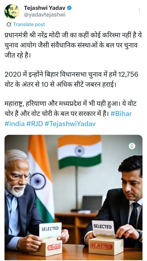 राजद नेता तेजस्वी यादव ने भी इस मुद्दे पर कांग्रेस का समर्थन किया। उन्होंने ट्वीट किया, “PM मोदी का कोई करिश्मा नहीं है। वह चुनाव आयोग जैसे संवैधानिक संस्थानों के बल पर जीत रहे हैं। 2020 के बिहार विधानसभा चुनाव में हमें 12,756 वोटों से 10 सीटें हराई गईं। महाराष्ट्र, हरियाणा और मध्य प्रदेश में भी यही हुआ।”