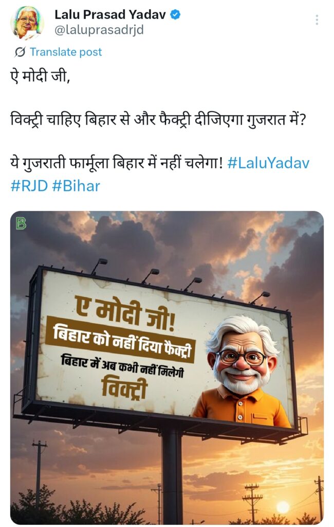 राजद सुप्रीमो लालू प्रसाद यादव ने बिहार विधानसभा चुनाव को लेकर प्रधानमंत्री नरेंद्र मोदी पर तीखा हमला बोला है। उन्होंने सोशल मीडिया पर एक व्यंग्यात्मक टिप्पणी करते हुए कहा, “मोदी जी, विक्ट्री चाहिए बिहार से, फैक्ट्री दीजिएगा गुजरात में?”। यह बयान प्रधानमंत्री के गुजरात में औद्योगिक विकास और बिहार की आर्थिक स्थिति पर सवाल उठाने के रूप में देखा जा रहा है।