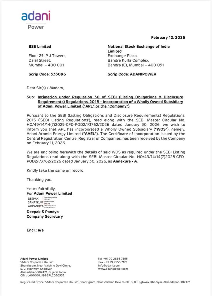 यह बयान ऐसे समय आया है जब Adani Power Limited ने शेयर बाजार को दी गई सूचना में अपनी एक पूर्ण स्वामित्व वाली सहायक कंपनी “Adani Atomic Energy Limited” के गठन की जानकारी दी है। कंपनी ने यह सूचना सेबी (SEBI) के लिस्टिंग नियमों के तहत स्टॉक एक्सचेंजों को भेजी है। दस्तावेज़ के अनुसार, नई इकाई का गठन परमाणु ऊर्जा क्षेत्र से जुड़े संभावित व्यावसायिक अवसरों की खोज के उद्देश्य से किया गया है।