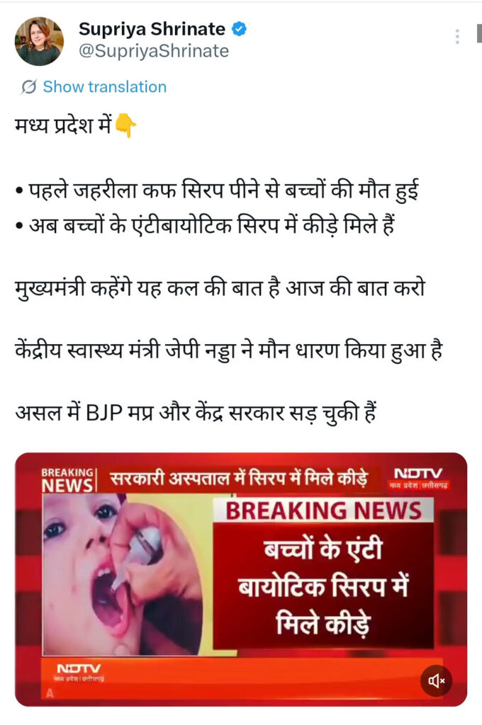 मध्य प्रदेश में स्वास्थ्य व्यवस्थाओं की बदहाली एक बार फिर सुर्खियों में है। पहले जहरीले कफ सिरप से बच्चों की मौत ने पूरे प्रदेश को झकझोर दिया था, और अब बच्चों के एंटीबायोटिक सिरप में कीड़े मिलने का मामला सामने आया है। माता-पिता का आक्रोश और जनता का गुस्सा इस बात का प्रतीक है कि राज्य की स्वास्थ्य प्रणाली पूरी तरह चरमराई हुई है।