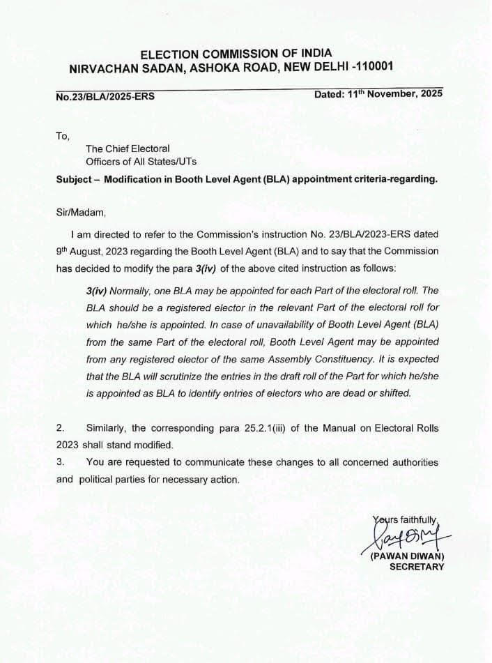 पार्टी का कहना है कि 2023 में जारी गाइडलाइंस के अनुसार, “BLA को उसी भाग (Part) के वोटर लिस्ट में पंजीकृत मतदाता होना अनिवार्य था”, यानी जो एजेंट किसी बूथ की वोटर लिस्ट देखेगा, उसे उसी इलाके का वोटर होना चाहिए। लेकिन अब आयोग के नए आदेश दिनांक 11 नवंबर 2025 के अनुसार यह नियम बदल दिया गया है। अब अगर उसी भाग में एजेंट न मिले, तो “किसी भी रजिस्टर मतदाता को उसी विधानसभा क्षेत्र से एजेंट बनाया जा सकता है।”