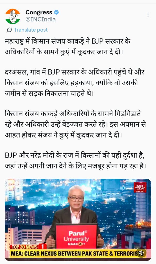 महाराष्ट्र से आई एक दर्दनाक खबर ने पूरे राज्य और देश की राजनीति को हिला कर रख दिया है। कांग्रेस पार्टी ने एक निजी चैनल की रिपोर्ट को आधार बनाते हुए BJP सरकार पर सीधा हमला बोला है। खबर के मुताबिक, महाराष्ट्र के किसान संजय काकड़े ने सरकारी अधिकारियों के सामने ही कुएं में कूदकर आत्महत्या कर ली। इस घटना ने किसानों की बदहाली और प्रशासनिक अमानवीय रवैये को एक बार फिर बहस के केंद्र में ला दिया है।