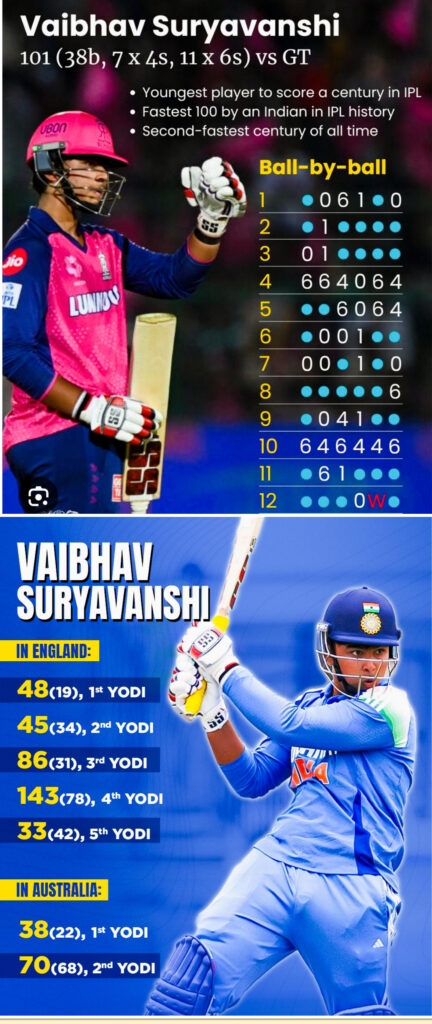 समस्तीपुर के मात्र 14 वर्षीय वैभव सूर्यवंशी ने चौंका दिया है — उन्होंने बिहार की रणजी टीम के उपकप्तान पद पर अपनी युवा प्रतिभा का भरोसा दिलाया है। आईपीएल 2025 में उन्होंने 101 रन केवल 38 गेंदों में जड़ कर सबसे कम उम्र के T20 शतकधारी बनकर इतिहास लिखा है। इस मैच में उन्होंने 11 छक्के और 7 चौके लगाये, और यह शतक केवल 35 गेंदों में पूरा कर लिया — जो कि भारतीय स्तर पर सबसे तेज़ IPL शतक बन गया।