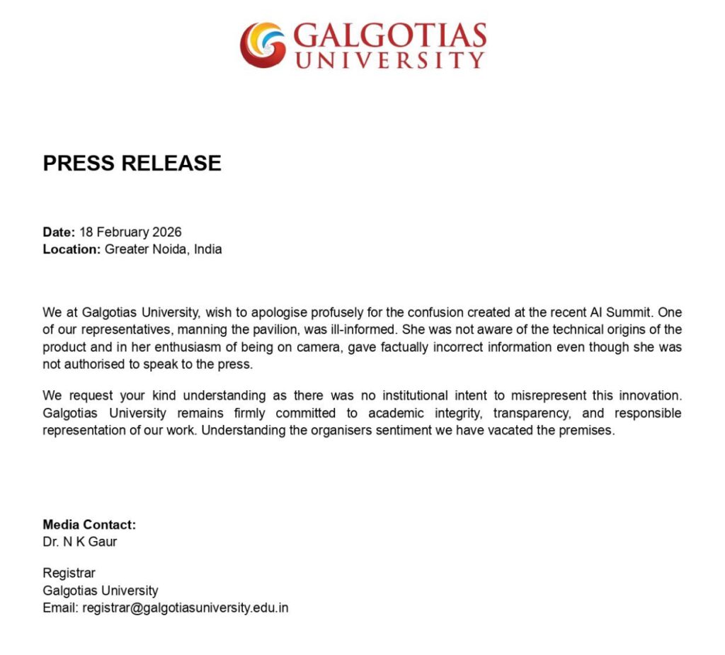 Galgotias University ने अपने स्पष्टीकरण में कहा कि स्टॉल पर मौजूद प्रतिनिधि पूर्ण तकनीकी विवरण से अवगत नहीं थीं और उन्होंने उत्साहवश गलत जानकारी दे दी। विश्वविद्यालय ने स्पष्ट किया कि रोबोटिक डॉग को केवल शैक्षणिक प्रदर्शन और छात्रों के प्रशिक्षण उद्देश्यों से प्रदर्शित किया गया था, न कि उसे स्वयं की मौलिक तकनीक के रूप में पेश करने का कोई इरादा था। संस्थान ने यह भी कहा कि वह भविष्य में ऐसे मामलों में अतिरिक्त सावधानी और आंतरिक सत्यापन प्रक्रिया लागू करेगा, ताकि किसी भी प्रकार की तथ्यात्मक त्रुटि दोबारा न हो।