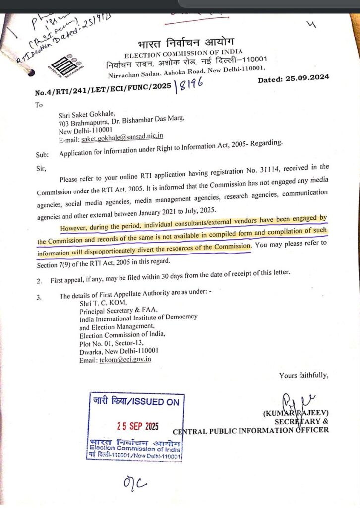 साकेत गोखले ने सोशल मीडिया पर पोस्ट करते हुए कहा “चुनाव आयोग के अंदर कुछ बहुत सड़ा हुआ चल रहा है। मैंने RTI में पिछले चार वर्षों में आयोग द्वारा नियुक्त सभी वेंडर्स, एजेंसियों और कंसल्टेंट्स की जानकारी मांगी थी, लेकिन आयोग ने यह कहते हुए इनकार कर दिया कि ‘जानकारी संकलित रूप में उपलब्ध नहीं है और उसे इकट्ठा करना संसाधनों का दुरुपयोग होगा।’”