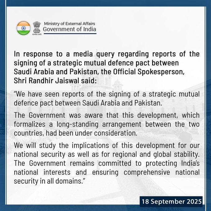 भारत सरकार ने इस समझौते की मूल बातें जानने और राष्ट्रीय सुरक्षा व क्षेत्रीय स्थिरता पर पड़ने वाले प्रभावों की समीक्षा करने की बात कही है। विदेश विभाग (MEA) के प्रवक्ता रणधीर जैस्वाल ने पत्रकारों से कहा कि भारत इस डील को गंभीरता से ले रहा है, नया संघर्ष टालने पर ज़ोर दे रहा है, और यह सुनिश्चित करेगा कि देश के हितों की रक्षा हो।