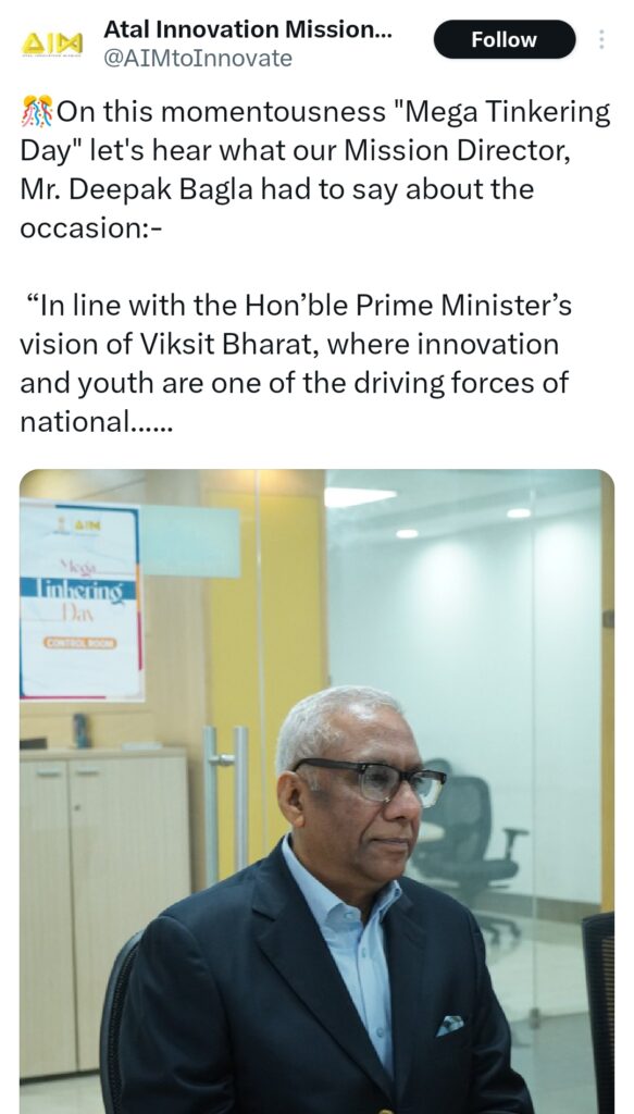 अटल इनोवेशन मिशन के मिशन निदेशक दीपक बगला ने इस अवसर पर कहा, “प्रधानमंत्री के विकसित भारत के विज़न के अनुरूप, जहां नवाचार और युवा राष्ट्रीय परिवर्तन की प्रमुख ताकत हैं, ‘मेगा टिंकरिंग डे 2025’ इस बात का सशक्त उदाहरण है कि जमीनी स्तर पर नवाचार किस तरह सामूहिक रचनात्मकता को जन्म देता है। एक ही घंटे में 10,000 से अधिक अटल टिंकरिंग लैब्स का एक साथ जुड़ना, लाखों छात्रों का एक साथ सीखना और निर्माण करना—यह विश्व में कहीं और नहीं हुआ है। यह भारत का क्षण है दुनिया को यह दिखाने का कि हमारे युवा दिमाग सिर्फ देश के लिए नहीं बल्कि पूरी दुनिया के लिए समाधान गढ़ सकते हैं।”