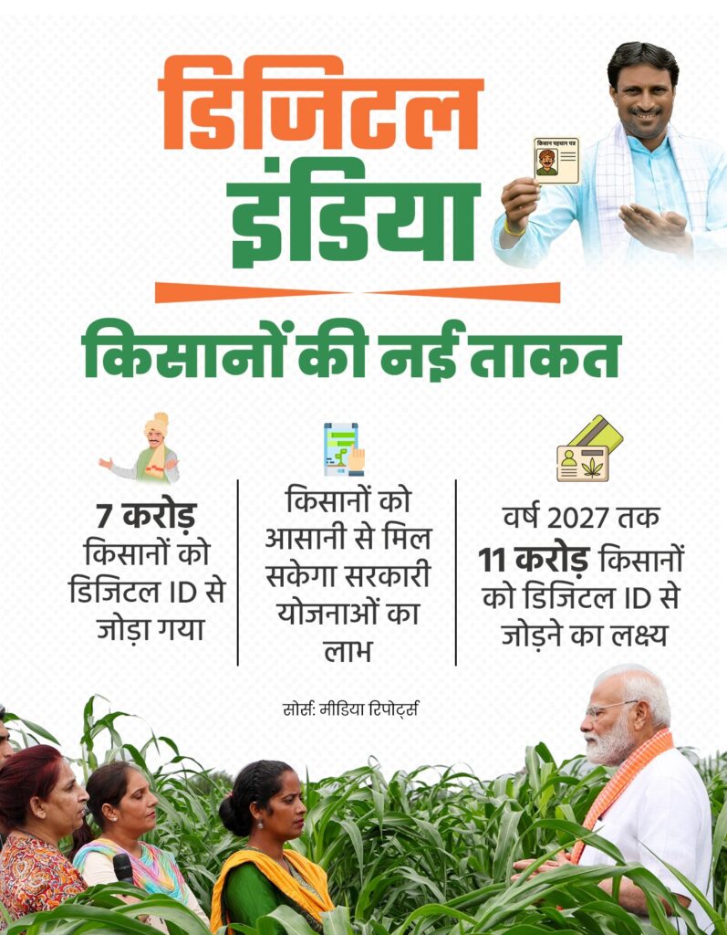दूसरी ओर, डिजिटल इंडिया पहल ने देश के किसानों को तकनीकी सशक्तिकरण के जरिए नई ताकत दी है। इस पहल के तहत अब तक 7 करोड़ किसानों को डिजिटल ID प्रदान की गई है, जिससे वे सरकारी योजनाओं, सब्सिडी, और कृषि से जुड़ी जानकारियों तक आसानी से पहुंच सकते हैं। सरकार ने महत्वाकांक्षी लक्ष्य रखा है कि वर्ष 2027 तक 11 करोड़ किसानों को डिजिटल ID से जोड़ा जाएगा।