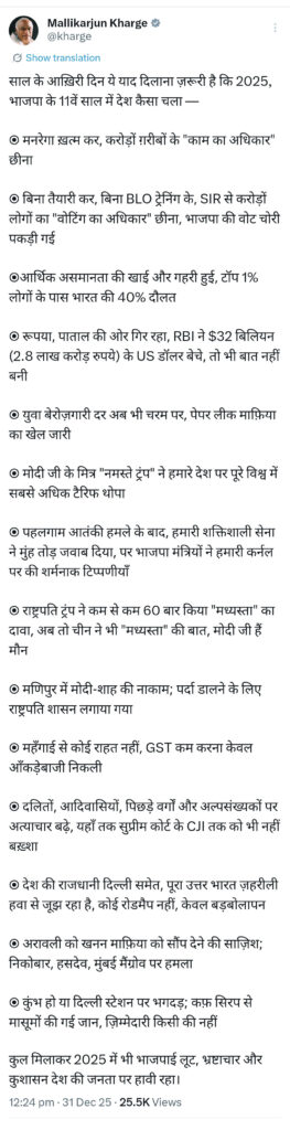 मल्लिकार्जुन खड़गे ने कहा कि कुल मिलाकर 2025 भी बीजेपी की लूट, भ्रष्टाचार और कुशासन का साल रहा, जिसमें देश की जनता को लगातार हाशिए पर धकेला गया। उनका कहना था कि यह वक्त आत्ममंथन और जवाबदेही का है, क्योंकि लोकतंत्र तभी बचेगा जब जनता के सवालों को सुना जाएगा, दबाया नहीं जाएगा।