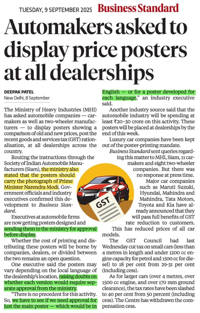 KPCC ने तंज कसते हुए कहा कि मोदी की तस्वीर, जो पुराने और उच्च जीएसटी दरों के लिए जिम्मेदार हैं, पोस्टरों के साथ बाईं ओर रखी जाए। यह निर्देश भारी उद्योग मंत्रालय ने इंडस्ट्री संस्थान SIAM के माध्यम से जारी किए हैं। कंपनियां इन पोस्टरों को डिजाइन कर मंत्रालय से अप्रूवल मांग रही हैं।