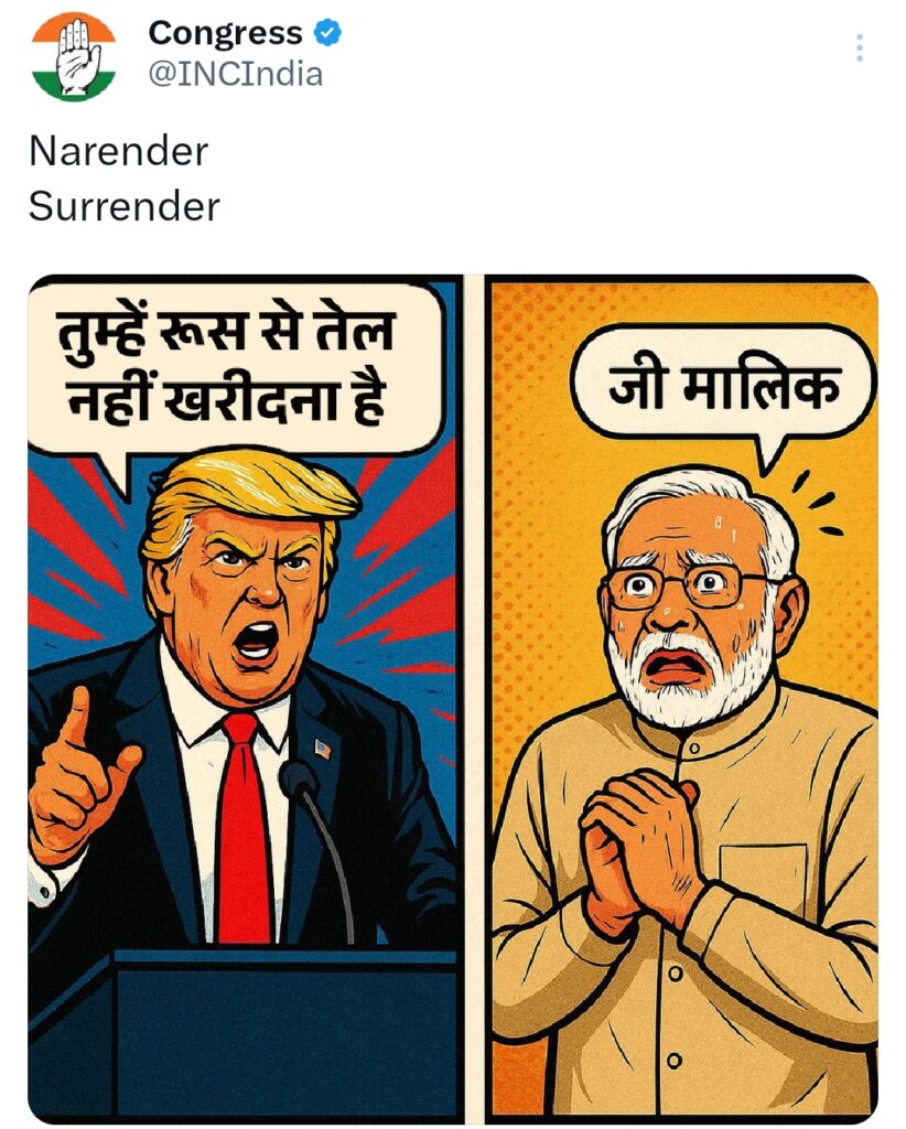 उन्होंने कहा, “इतना सब कुछ कहा जा रहा है — ऑपरेशन सिंदूर पर, रूस से तेल खरीदने पर — लेकिन प्रधानमंत्री मोदी की आवाज़ कहीं सुनाई नहीं दे रही। आखिर वे किस डर से चुप हैं? क्या वे ट्रंप से डरते हैं?” कांग्रेस नेता ने कहा कि देश के लोग अब यह जानना चाहते हैं कि क्या उनकी सरकार भारत की है या किसी विदेशी दबाव में चलने वाली सत्ता है।