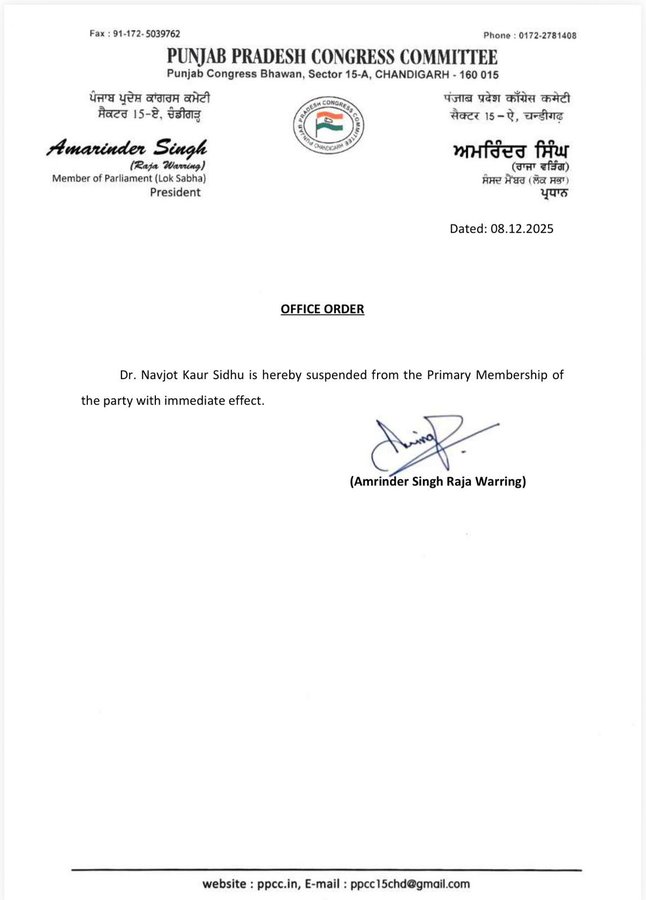 पंजाब की राजनीति आज उस समय गरम हो गई जब पंजाब प्रदेश कांग्रेस कमेटी (PPCC) ने एक आधिकारिक आदेश जारी करते हुए पूर्व राज्यसभा सदस्य और नवजोत सिंह सिद्धू की पत्नी डॉ. नवजोत कौर सिद्धू को पार्टी की प्राथमिक सदस्यता से तत्काल प्रभाव से निलंबित कर दिया। यह फैसला प्रदेश कांग्रेस अध्यक्ष अमरिंदर सिंह राजा वड़िंग द्वारा हस्ताक्षरित आदेश के साथ सार्वजनिक किया गया, जिसमें साफ लिखा गया कि उनका निलंबन तुरंत लागू होता है। यह कदम कांग्रेस हाईकमान की उस नाराज़गी का प्रत्यक्ष परिणाम माना जा रहा है जो पिछले दिनों नवजोत कौर द्वारा लगाए गए विवादित आरोपों के बाद लगातार बढ़ रही थी।