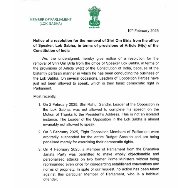 नोटिस में साफ शब्दों में कहा गया है कि स्पीकर का लगातार एकतरफा रवैया संसद की संस्थागत विश्वसनीयता को कमजोर कर रहा है और करोड़ों मतदाताओं की आवाज़ को अप्रत्यक्ष रूप से दबा रहा है।