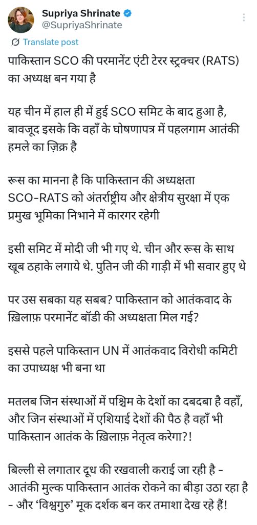 “यह कैसी विदेश नीति है कि आतंकवाद को शह देने वाला पाकिस्तान आज अंतरराष्ट्रीय मंचों पर आतंकवाद के खिलाफ नेतृत्व की भूमिका निभा रहा है? SCO हो या UN, हर जगह पाकिस्तान को जिम्मेदारी मिल रही है और भारत का तथाकथित ‘विश्वगुरु’ नेतृत्व केवल मूकदर्शक बना हुआ है। क्या यह हमारी कूटनीति की विफलता नहीं है?”
