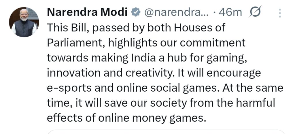 प्रधानमंत्री नरेंद्र मोदी की सरकार ने इस बिल को पास कर यह संदेश दिया है कि जब भी बात परिवारों की सुरक्षा और समाज के कल्याण की आती है, तो राजस्व या किसी कारोबारी लाभ को प्राथमिकता नहीं दी जाती। जैसे अन्य मौकों पर प्रधानमंत्री ने मध्यम वर्ग और आम जनता को आगे रखा है, वैसे ही इस बिल के ज़रिए भी साफ कर दिया गया है कि भारत में केवल वही ऑनलाइन गेमिंग टिकेगी, जो युवाओं की प्रतिभा, नवाचार और रचनात्मकता को बढ़ाए।