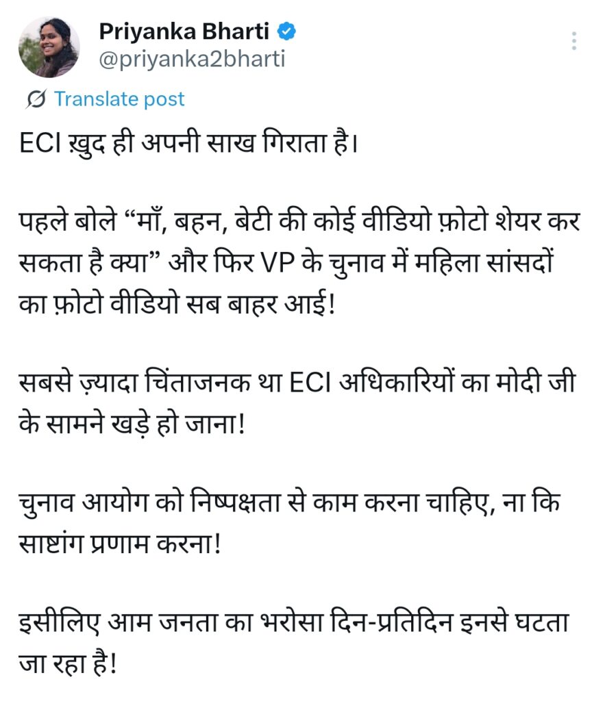 प्रियंका भारती ने जोर देकर कहा, “चुनाव आयोग को तुरंत सुधारात्मक कदम उठाने चाहिए, नहीं तो यह न केवल अपनी प्रतिष्ठा खो देगा, बल्कि पूरे लोकतंत्र को भी नुकसान पहुंचाएगा।” उन्होंने चुनाव आयोग के सामने यह चुनौती रखी कि जनता की नजर में अपनी छवि सुधारने का समय अब आया है।