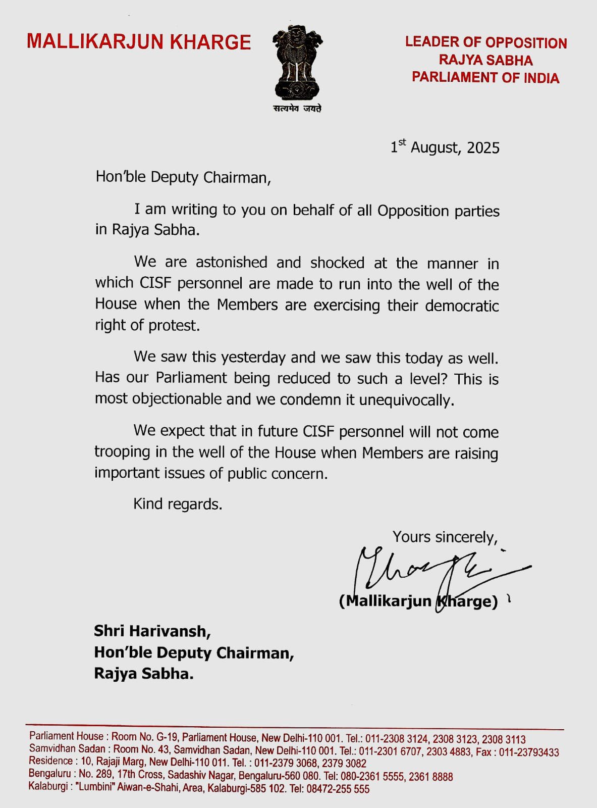 खड़गे ने पत्र में सवाल उठाया है कि जब सांसद जनहित के मुद्दों पर विरोध दर्ज करा रहे थे, तब CISF के जवानों को वेल में भेजना क्या उचित था? उन्होंने लिखा, “हमने यह कल भी देखा और आज भी। क्या संसद अब इतनी गिर गई है?” उन्होंने स्पष्ट किया कि भविष्य में ऐसा दोहराया जाना पूरी तरह से अस्वीकार्य होगा।