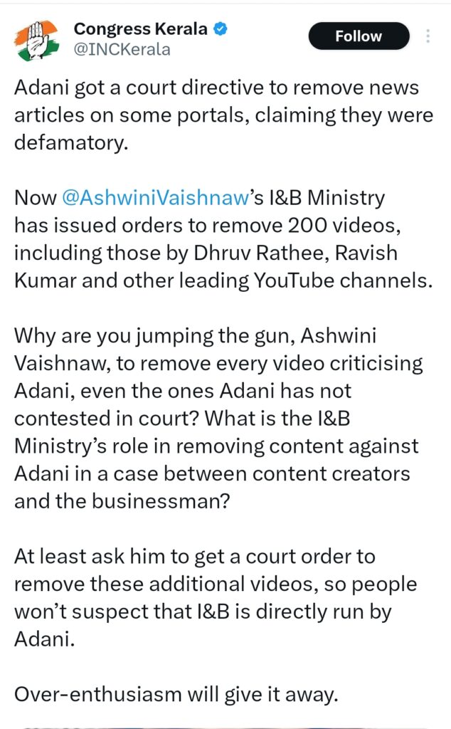 कांग्रेस ने पूछा कि अश्विनी वैष्णव, आप इतनी जल्दीबाज़ी क्यों कर रहे हैं हर वह वीडियो हटाने में जो अदाणी की आलोचना करता है — यहाँ तक कि उन पर भी, जिन पर अडानी ने अदालत में कोई आपत्ति दर्ज नहीं कराई? सूचना एवं प्रसारण मंत्रालय की क्या भूमिका है? क्या आपका काम अडानी के ख़िलाफ़ सामग्री हटवाने का काम है? वो भी जब मामला कंटेंट क्रिएटर्स और एक व्यापारी के बीच है?