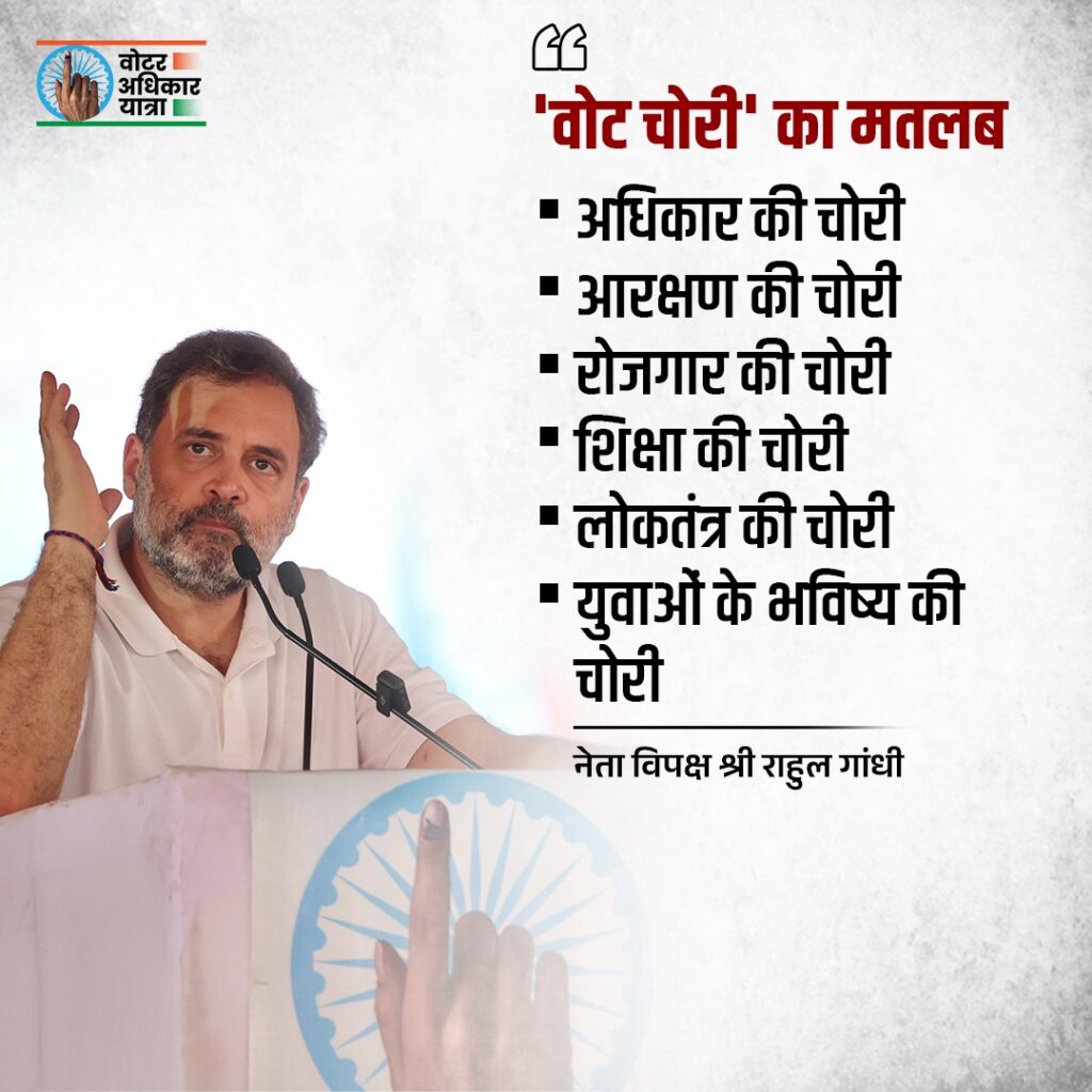 राहुल गांधी ने साफ किया कि जिन ताकतों ने महात्मा गांधी की हत्या की, वही अब संविधान की हत्या करने की कोशिश कर रही हैं। उन्होंने कहा कि कांग्रेस इसे कभी नहीं होने देगी और जनता के साथ मिलकर लोकतंत्र और मताधिकार की रक्षा करेगी। नया नारा “वोट चोर – गद्दी छोड़” पूरे देश में जोर पकड़ चुका है। राहुल ने बिहार को क्रांतिकारी प्रदेश बताते हुए कहा कि यह राज्य पूरे देश को संदेश दे रहा है कि वोट की चोरी बर्दाश्त नहीं की जाएगी और लोकतंत्र मजबूत रहेगा।