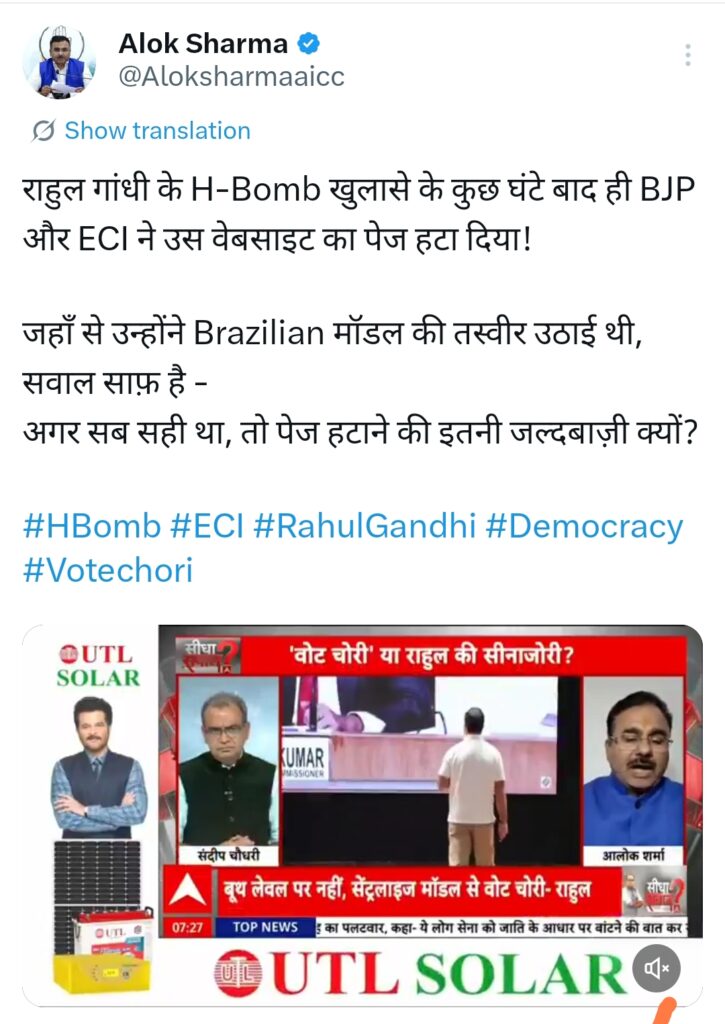 राहुल गांधी ने जिस “Brazilian Model of Vote Fraud” से संबंधित वेबसाइट पेज को सार्वजनिक किया था, उसे कुछ ही घंटों के भीतर ECI की वेबसाइट से हटा दिए जाने को लेकर देशभर में गंभीर सवाल उठ रहे हैं। कांग्रेस प्रवक्ता आलोक शर्मा ने इस कार्रवाई पर टिप्पणी करते हुए कहा कि “अगर सब सही था, तो इतनी घबराहट क्यों?” यह प्रश्न अब केवल विपक्षी दल ही नहीं, आम जनता भी पूछ रही है, जिससे चुनाव आयोग की मंशा पर संदेह गहराता जा रहा है। यह सिर्फ वोट चोरी नहीं, लोकतंत्र की हत्या है।
