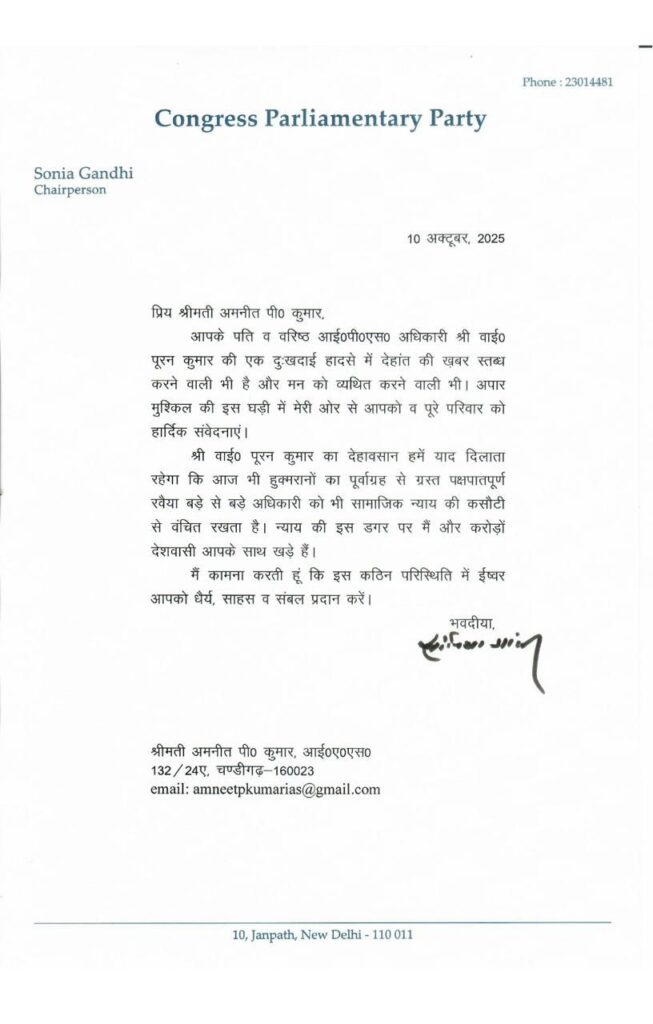 कांग्रेस संसदीय दल की चेयरपर्सन सोनिया गांधी ने हरियाणा के वरिष्ठ आईपीएस अधिकारी श्री वाई. पूरन कुमार की दुखद और स्तब्ध कर देने वाली मौत के बाद, उनकी पत्नी अमनीत पी. कुमार को एक अत्यंत भावुक और मार्मिक पत्र लिखकर अपनी गहरी संवेदना व्यक्त की है। यह पत्र न केवल एक शोक संदेश है, बल्कि यह एक ईमानदार अधिकारी के उत्पीड़न और अंततः उसकी दुखद समाप्ति के पीछे काम करने वाली पूर्वाग्रह से ग्रस्त प्रशासनिक व्यवस्था पर एक तीखा प्रहार भी है।