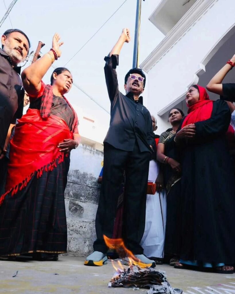 स्टालिन ने कहा कि 1960 के दशक में हिंदी विरोधी आंदोलन की आग हमने बुझाई नहीं थी, दिल्ली झुक गई थी। आज फिर मैंने उस आग को भड़का दिया है। यह काला कानून तमिलों को अपनी ही भूमि पर शरणार्थी बनाने की साजिश है। यह आग पूरे द्रविड़ भूमि में फैलेगी और भाजपा की घमंड को कुचल देगी। मुख्यमंत्री ने राज्यवासियों से अपील की थी कि 16 अप्रैल को हर घर, दुकान और सार्वजनिक स्थानों पर काला झंडा फहराया जाए। डीएमके अध्यक्ष के रूप में स्टालिन इस मुद्दे पर लगातार केंद्र सरकार पर हमला बोल रहे हैं।