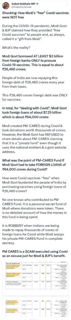कोविड महामारी के दौरान मोदी सरकार और भाजपा ने लगातार यह दावा किया कि देशवासियों को “फ्री कोविड वैक्सीन” दी जा रही है। इसे बार-बार प्रधानमंत्री मोदी का तोहफ़ा बताया गया। लेकिन अब सामने आ रहा है कि यह ‘तोहफ़ा’ असल में विदेशी बैंकों से लिए गए कर्ज़ का बोझ था, जिसे जनता अपने टैक्स से चुका रही है। इस सिलसिले की पोल खोल करते हुए तृणमूल कांग्रेस के सांसद साकेत गोखले ने X पर कच्चे चिट्ठे को उजागर किया है।