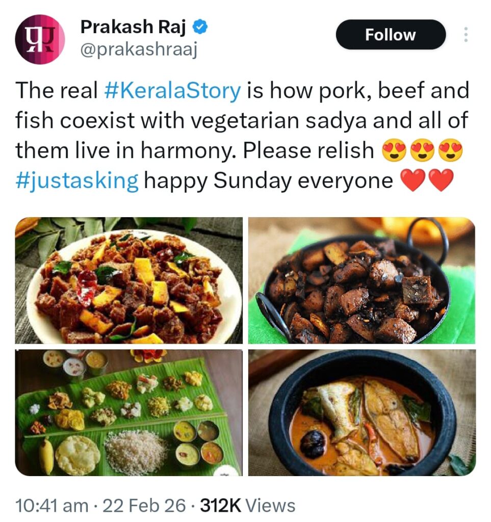 इस विवाद के बीच अभिनेता प्रकाश राज का X (ट्विटर) पोस्ट तेजी से वायरल हो गया। उन्होंने फिल्म पर सीधे बयान देने के बजाय केरल के पारंपरिक बीफ, पोर्क, मछली और शाकाहारी व्यंजनों की तस्वीरें साझा करते हुए लिखा कि “असल केरल स्टोरी यह है कि पोर्क, बीफ, मछली और शाकाहारी सद्या सौहार्द के साथ एक ही समाज में मौजूद हैं।” प्रकाश राज का यह पोस्ट फिल्म के कथित विभाजनकारी नैरेटिव पर तंज के रूप में देखा जा रहा है। उन्होंने केरल की बहुसांस्कृतिक और बहु-खाद्य परंपरा को रेखांकित करते हुए कहा कि राज्य की पहचान विविधता और सह-अस्तित्व से बनती है, न कि डर और टकराव से। उनके इस पोस्ट पर सोशल मीडिया में समर्थन और आलोचना दोनों देखने को मिले, जिससे विवाद और तेज हो गया।