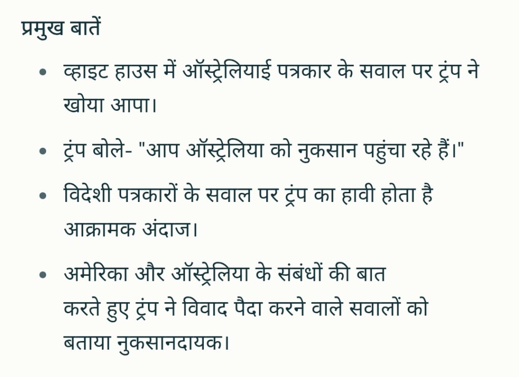 व्हाइट हाउस में एक प्रेस कांफ्रेंस के दौरान अमेरिकी राष्ट्रपति डोनाल्ड ट्रंप उस समय भड़क उठे जब ऑस्ट्रेलियाई पत्रकार ने उनसे अमेरिकी विदेश नीति को लेकर तीखा सवाल पूछ लिया। ट्रंप ने पत्रकार के सवाल पर गुस्से में प्रतिक्रिया दी और कहा, “आप ऑस्ट्रेलिया को नुकसान पहुंचा रहे हैं।” ट्रंप ने पत्रकार की आलोचना करते हुए यह भी कहा कि इस तरह के सवाल विदेशी देशों के हित में नहीं होते हैं और इससे दोनों देशों के रिश्ते प्रभावित हो सकते हैं।