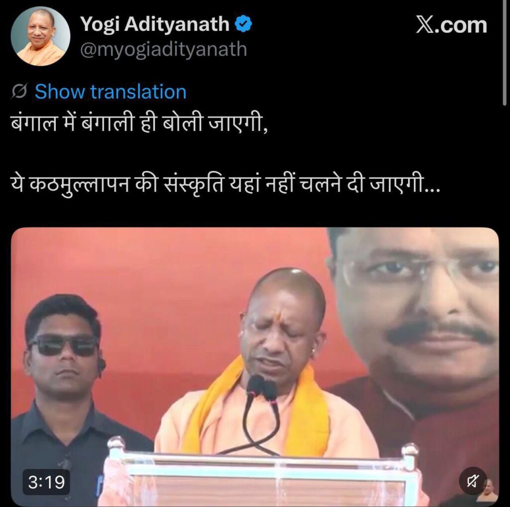 उत्तर प्रदेश के मुख्यमंत्री योगी आदित्यनाथ ने एक बार फिर अपने आक्रामक और विभाजनकारी अंदाज में बयान देकर पूरे देश को चौंका दिया है। रविवार को जारी एक वीडियो संदेश में योगी ने साफ-साफ कहा कि बंगाल में बंगाली ही बोली जाएगी, ये कठमुल्लापन की संस्कृति यहां नहीं चलने दी जाएगी…। एक सिटिंग चीफ मिनिस्टर के मुंह से “कठमुल्ला” जैसे घृणित और अपमानजनक शब्द का इस्तेमाल न सिर्फ मुस्लिम समुदाय की भावनाओं पर सीधा हमला है, बल्कि पूरे संवैधानिक मूल्यों को ठुकराने वाला है। दरअसल, “कठमुल्लापन” नहीं, असल समस्या “विभाजनकारी मानसिकता” है — जो योगी जैसे नेताओं के बयानों में साफ दिख रही है।
